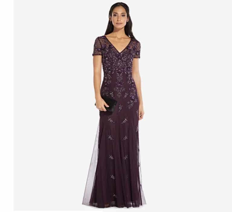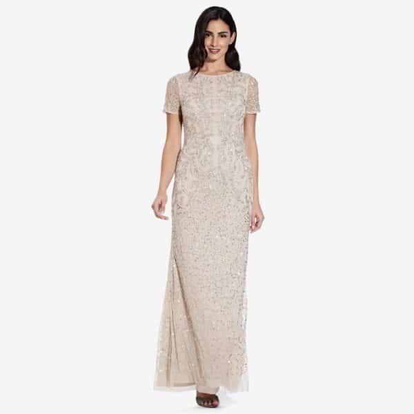 This long sequin dress is a great dress for the mother of the bride and is available in biscotti, a neutral shade that suits many different skin tones. The cut offers mothers an appropriate level of coverage for many types of celebrations and is also available in Adrianna Papell’s plus-size section.