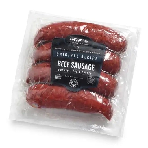 Each Wagyu Smoked Beef Sausage weighs 2 ounces. They are sold in packs of four for $18.